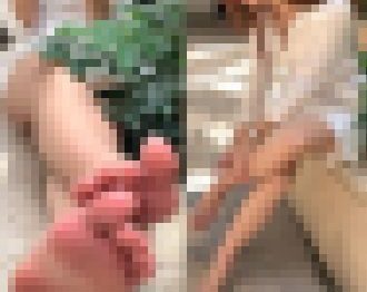 歩道の植え込みに座って、突然ヒールを脱ぎだした美脚美人さん。 足の裏が相当汗ばん
