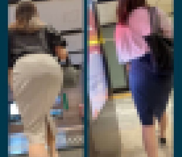オフィスカジュアルながら、圧倒的なボリュームのタイトスカートでそのボリュームを見せつけるOLさんお二人です。
